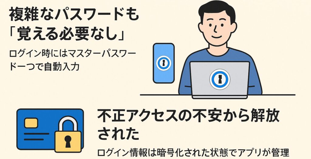 複雑なパスワードを使い、ログイン情報は暗号化された状態でアプリが管理。安心感がまるで違います。