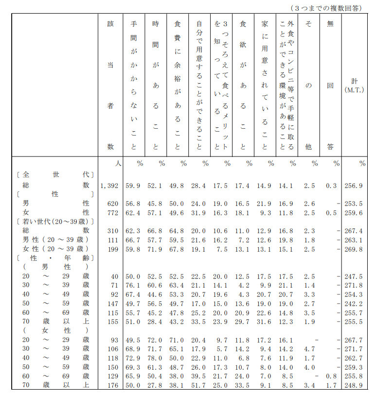 農林水産省の「食育に関する意識調査報告書」に、主食・主菜・副菜を揃えて食べるために必要なことというアンケート結果があります。