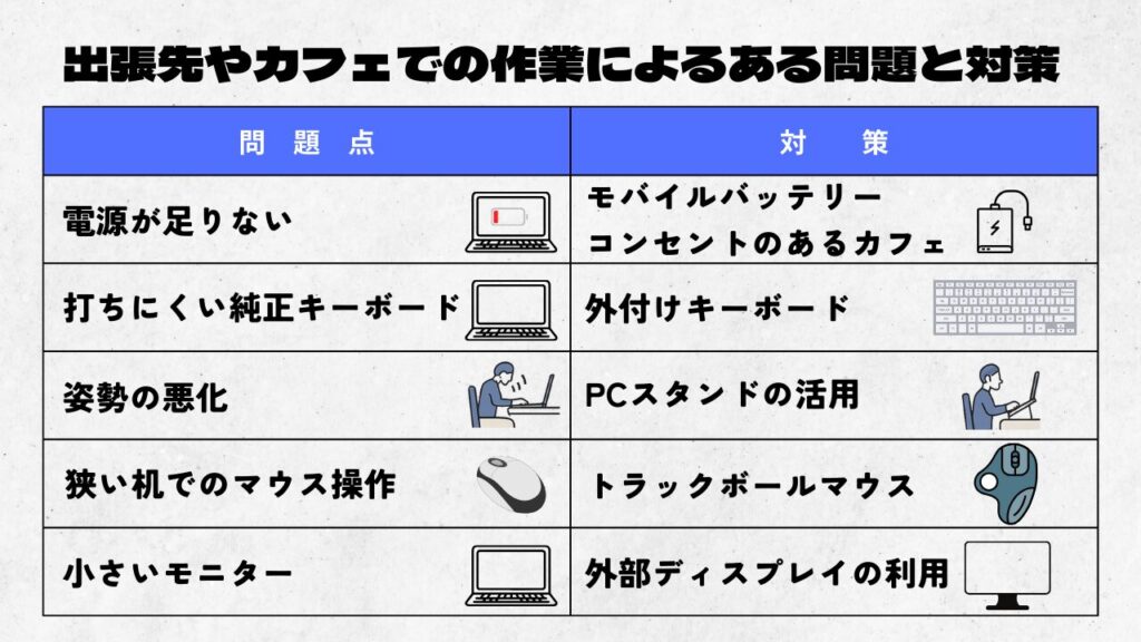 | ✕ 電源が足りない | モバイルバッテリーを活用/コンセントのあるカフェやワークスペースを選ぶ |